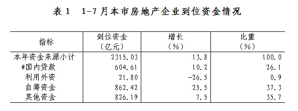 1-7月,本市房地产开发企业本年到位资金2315.03亿元,比去年同期增长13.8%。从资金来源渠道看,利用外资继续下降,国内贷款、自筹资金和其他资金保持增长趋势(见表1)。