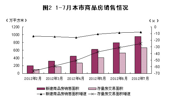 1-7月,本市新建商品房销售面积953.98万平方米,比去年同期下降7.8%,降幅较上月收窄1个百分点。其中,商品住宅销售面积844.24万平方米,下降1.6%;办公楼销售面积51.49万平方米,下降36.4%;商业营业用房销售面积37.9万平方米,下降37.1%。