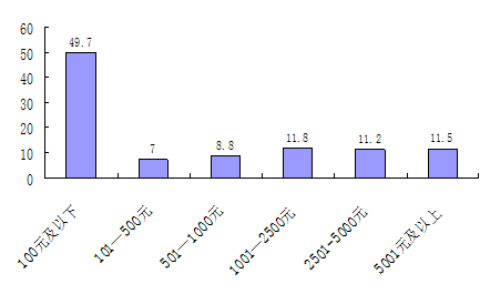 当问及今年以来平均一个月的外出旅游消费时,49.7 %的市民表示每月消费在100元以内,7%的市民表示在101-500元内,表示每月外出旅游消费在1001元及以上的市民比重占34.5 %(见图8)。