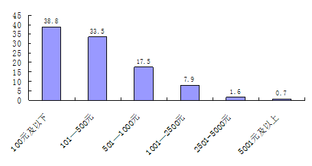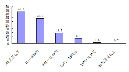 当问及今年以来平均一个月的服装饰品化妆品消费时,43.1%的市民表示每月消费在100元以内, 33.8%表示在101-500元内,表示每月服装饰品化妆品消费在1001元及以上的市民比重占8.9%,仅有0.1%的市民表示每月消费在5001元及以上(见图5)。