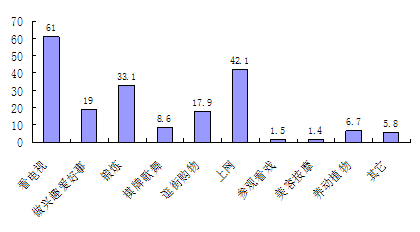 当问及工作日下班后的主要休闲方式时,61%的市民选择“看电视”,比重居所有选项之首。其余居前五位的选择率依次是“上网”(42.1%)、“锻炼”(33.1%)、“做兴趣爱好的事”(19%)和“逛街购物”(17.9%)。市民选择率最低的休闲方式是 “参观看戏”和“美容按摩”,仅占1.5%和1.4%(见图2)。