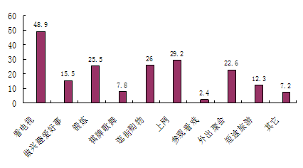 当问及周末的主要休闲方式时,48.9%的市民选择“看电视”,比重居所有选项之首。其余居前五位的选择率依次是“上网”(29.2%)、“逛街购物”(26%)、“锻炼”(25.5%)和“外出聚会”(22.6%)。市民选择率最低的也是 “参观看戏”,仅占2.4%(见图3)。