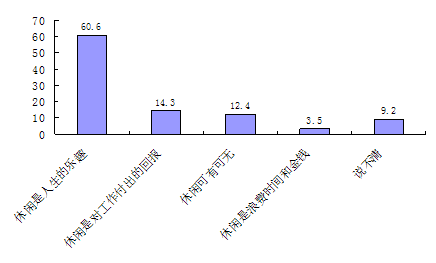 调查显示,大多数上海市民对“休闲”表现出高度的理解和认同,反映出上海市民整体上具备现代化的文化素质和积极的人生态度。调查显示,当问及您是怎样看待“休闲”时,60.6%的市民选择“休闲是人生的乐趣”,选择率为最高;其次是选择“休闲是对工作付出的回报”,占14.3%,两者合计比重为74.9%。对“休闲”态度消极的市民仅占15.9%。其中,认为“休闲可有可无”的占12.4%,认为“休闲是浪费时间和金钱”的占3.5%。另有9.2%的市民表示说不清(见图1)。