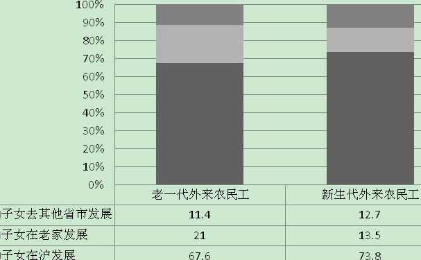 在已生育子女的本市外来农民工中,期望子女来沪读书、生活、发展事业的占69.2%,希望在老家生活的占19.1%,希望去其他省市发展的占11.7%。其中80后新生代农民工父母期望子女来沪发展的比重(73.8%)高出平均水平4.6个百分点(见图2)。