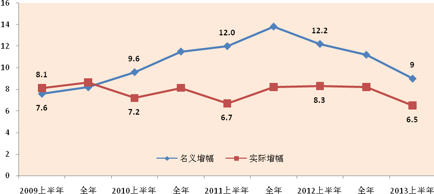 上海市统计局 2013-08-05抽样调查显示,上半年,本市农村居民家庭人均可支配收入11454元,比去年同期增长9%,增幅回落3.2个百分点。剔除价格因素影响,实际增长6.5%(见图1、表1)。