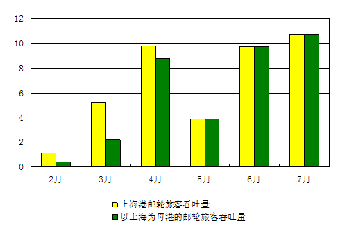 图2 2013年1-7月上海港邮轮旅客吞吐量与母港邮轮旅客吞吐量 单位:万人