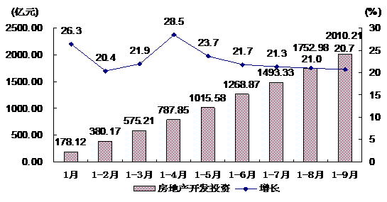 前三季度,本市房地产开发投资2010.21亿元,比去年同期增长20.7%,增幅同比上升8.5个百分点,年初以来房地产开发投资保持20%以上的增长水平(见图1)。前三季度,房地产开发投资占全社会固定资产投资的53.5%,比重同比上升4.2个百分点。