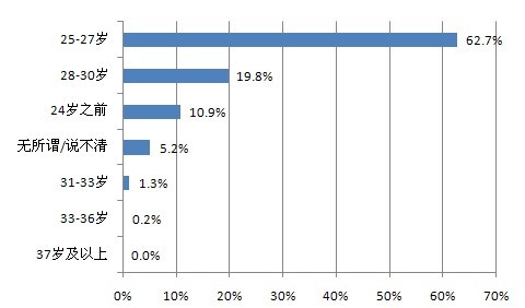 当问及“女性多大年龄生育孩子比较合适”时,62.7%的市民认为应该在25-27岁,19.8%认为在28-30岁,10.9%认为在24岁前(见图7)。