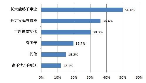 当对选择喜欢男孩的市民问及“喜欢男孩的原因”(可多选)时, 50%的市民认为男孩长大能够干事业,36.4%的市民认为男孩长大父母有依靠,30.3%的市民认为男孩可以传宗接代(见图6)。