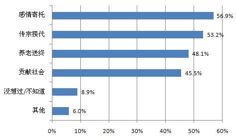 调查显示,当问及“生育孩子的意义是什么”(可多选)时,56.9%的市民认为生育孩子是感情寄托,53.2%认为是传宗接代,48.1%认为是养老送终,45.5%认为是贡献社会(见图4)。