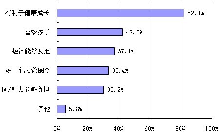 当对希望生育二胎及以上的市民询问其原因时(可多选),82.1%表示是有利于孩子健康成长,42.3 %表示是喜欢孩子,37.1%表示是经济能够负担(见图1)。