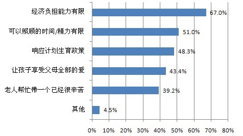 当对希望生育一胎的市民询问原因时(可多选),67%表示是经济负担能力有限,51%表示是可以照顾的时间或精力有限,48.3%表示是响应计划生育政策(见图2)。
