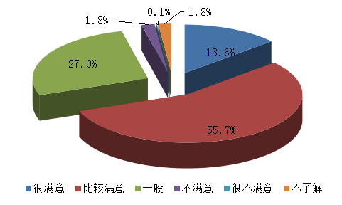 已经实行垃圾分类的居民对目前小区垃圾分类减量情况的评价较好,其中“很满意”占13.6%,“较满意”占55.7%,“一般”占27%,“不满意”占1.8%,“很不满意”占0.1%,另有1.8%表示“不了解”(见图2)。
