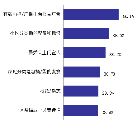 垃圾分类的宣传教育主要是让市民都树立干湿分类的理念,通过宣传告知市民推进垃圾干湿分类将彻底改变分拣、收集、转运、处置体系,最大限度地减少末端处置量,提高处置效率,节约处置能源。调查显示,市民希望获取垃圾分类信息途径排前三位的分别是“有线电视/广播电台公益广告”,“小区分类桶的配备和标识”和“居委会上门宣传”(可多选,见图4)。要推进市民生活垃圾分类减量行为,66.6%受访者认为政府应“组织电视、广播、报纸和网络等媒体,通过公益广告等形式开展垃圾分类减量的媒体宣传工作”。