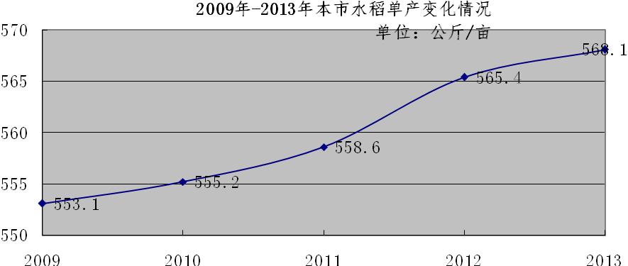 2.水稻拉动秋粮单产连续五年稳定增长。今年本市秋粮单产为每亩553.3公斤,比去年增加6.7公斤,增长1.2%,这是继2009年以来第五年稳定增长。秋粮单产实现稳定增长,一是得益于水稻单产增加。今年本市水稻单产为每亩568.1公斤,比去年增加2.7公斤,增长0.5%,连续五年创历史新高(见下图)。经测算,水稻单产增加拉动秋粮单产增长0.5个百分点。二是得益于水稻播种面积比重上升。近几年,本市玉米、豆类和薯类综合单产维持在330公斤/亩左右,明显低于水稻单产。经测算,水稻播种面积比重上升拉动秋粮单产增长约0.7个百分点。