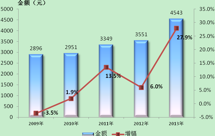 2009~2013年本市农村居民家庭人均服务性消费支出