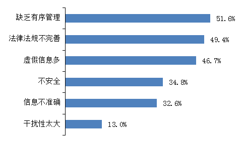 新媒体与传统媒体的发展都还面临着一系列的问题。新媒体发展面临的前三位问题是:“缺乏有序管理”、“法律法规不完善”以及“虚假信息多”(见图4)。