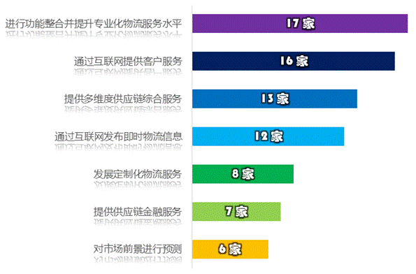 调研企业积极利用“互联网+”技术、方法和思维去改造和优化物流全产业链,促进物流运营模式全方位的创新发展,从而产生更高的附加值。调研中,17家企业进行功能整合并提升专业化物流服务水平;16家通过互联网提供客户服务;13家提供多维度供应链综合服务;12家通过互联网发布即时物流信息;8家发展定制化物流服务;7家提供供应链金融服务;6家对市场前景进行预测。“互联网+”在思维、理念、模式上都对物流产业产生了深远的影响,有力推动服务模式创新。