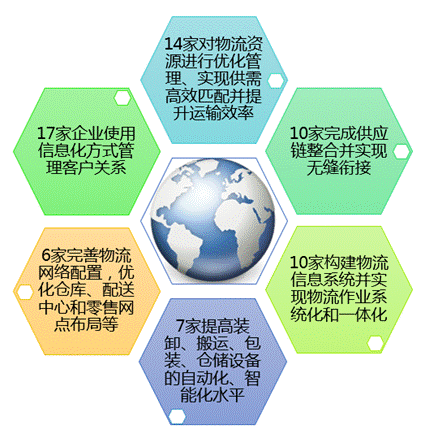 借助于“互联网+”的深度融合,物流变得更加智慧化、智能化,许多企业形成了新型的物流管理模式。调研中,17家企业使用信息化方式管理客户关系;14家对物流资源进行优化管理、实现供需高效匹配并提升运输效率;10家完成供应链整合并实现无缝衔接;10家构建物流信息系统并实现物流作业系统化和一体化;7家提高装卸、搬运、包装、仓储设备的自动化、智能化水平;6家完善物流网络配置,优化仓库、配送中心和零售网点布局等。一家企业表示,其第三方物流平台一般能帮助客户降低20%-30%的成本。通过物流资源整合和智能优化配置,大大降低了社会物流成本,使费用高、效率低的传统局面迅速转变。