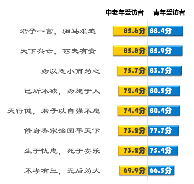调查显示,在问卷列举的八种带有典型意义的传统思想表述中,除“不孝有三,无后为大”外,青年受访者对其他七种表述的认同度均高于35岁以上群体(见图3)。“君子一言,驷马难追”、“天下兴亡,匹夫有责” 、“勿以恶小而为之,勿以善小而不为”、“己所不欲,勿施于人”、“天行健,君子以自强不息”,这些凝聚着中华民族传统标志的经典表述获得青年受访者的广泛认同。