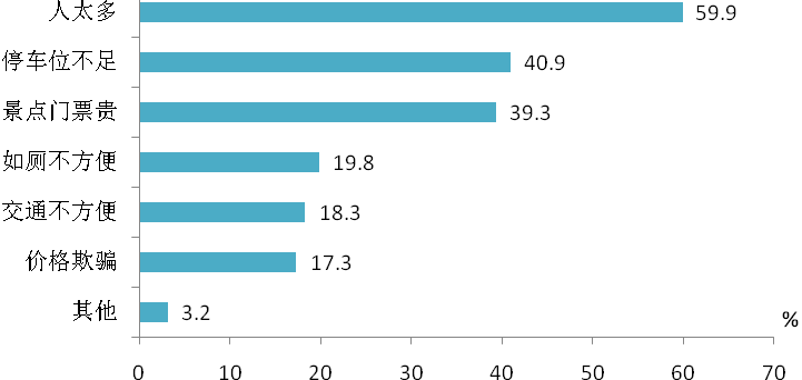 市民对上海市内旅游环境不吝赞许,但市民也对市内旅游中存在的一些问题表明了意见。调查显示,59.9%受访市民在市内旅游休闲时碰到的最大问题为人太多,景点停车位不足为40.9%;景点门票贵为39.3%(见图4)。统计数据显示,2015年末,上海的常住人口达到2415.27万。人口规模不断增长和生活水平的提高,扩大了市民对旅游的需求,这一方面大幅度提高了旅游资源利用率,另一方面,也导致很多景点超负荷接待,降低了旅游品质。