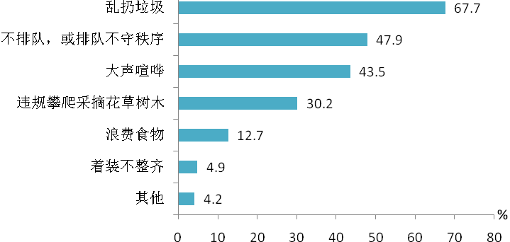 文明旅游,为自己也为别人创造一个良好的旅游环境是每个公民应尽的职责,随着旅游规模不断扩大,游客的不文明现象也时有发生。调查显示,在市内旅游休闲中,受访市民感受最深也是最受到诟病的不文明现象依次为乱扔垃圾、不排队或排队不守秩序以及大声喧哗(见图5)。