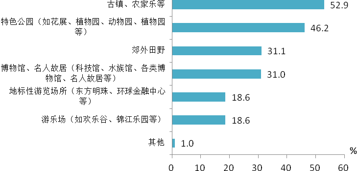 近年来,上海古镇、农家乐等旅游景点,在游乐设施和交通配套等方面,都有很大程度完善,对市民的吸引力不断增强。调查显示,52.9%的受访市民喜欢去古镇、农家乐等,选择比例位列各类市内旅游景点之首。此外,市民对郊外田野的旅游兴致也较高,选择比例达31.1%(见图2)。
