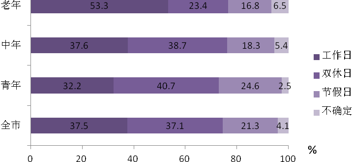 调查显示,在年内有游园意愿的受访市民中,53.3%的老年受访市民选择在工作日游园,比中年受访市民和青年受访市民的比例分别高出15.7个百分点和21.1个百分点(见图6)。