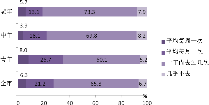 从市内旅游的频率看,不同年龄段市民之间有明显差异,呈现年龄越大旅游频率越低的态势。以平均每月一次为例,青年受访市民(16-40周岁,下同)的比例为26.7%,中年受访市民(41-60周岁,下同)为18.1%,而老年受访市民(60周岁以上,下同)为13.1%(见图1)。
