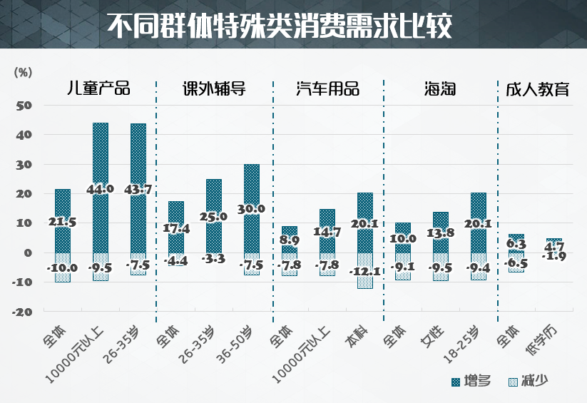 从不同群体看,儿童产品需求集中在26-35岁群体及中高收入群体,需求度高达+36.2%和+34.5%;子女课外辅导需求集中在26-35岁和36-50岁群体,需求度高达+21.6%和+22.6%,几乎贯穿子女从幼儿园至高中的学习生涯;汽车用品需求集中在中高消费群体,月收入10000元以上和高学历的需求度分别为+6.9%和+8.1%;“海淘族”集中在女性及青年群体,需求度分别为+4.4%和+10.8%。