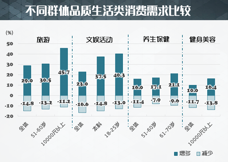 从不同群体看,中老年人对生活品质提升的追求明显,51-60岁的旅游、养生保健需求度分别为+17.3%、+9.3%,61-70岁的养生保健需求度为+11.5%,均高于全体样本。中高消费层次群体依然是品质类消费主力军,如月薪10000元以上对旅游和健身美容(+34.5%和+2.6%)、高学历对文娱活动(+22.7%)的需求均高于全体样本。值得关注的是,80后群体正处于工作、家庭双重压力的高峰期,使其对品质生活“心有余而力不足”,26-35岁的旅游、养生保健和健身美容需求度分别为+11%、-5.1%和-0.6%,均低于全体样本。