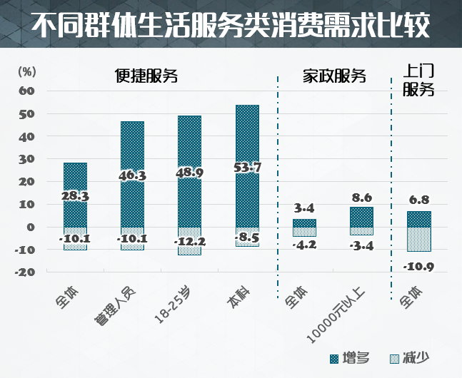 从不同群体看,便捷服务因其应用领域广、使用灵活度高、费用支出低等优势,在各类人群(除老年人外)均有较高需求,尤其是管理人员、18-25岁群体和高学历人员的需求度高达+36.2%、+36.7%和+45.2%。家政服务在月薪10000元以上人群有一定需求,为+5.2%;原本为重要受众群体的老年人,受传统养老和节约型消费等观念影响,需求度仅为+0.5%。上门服务则在各类人群中的需求均较低,市场培育尚需时日。