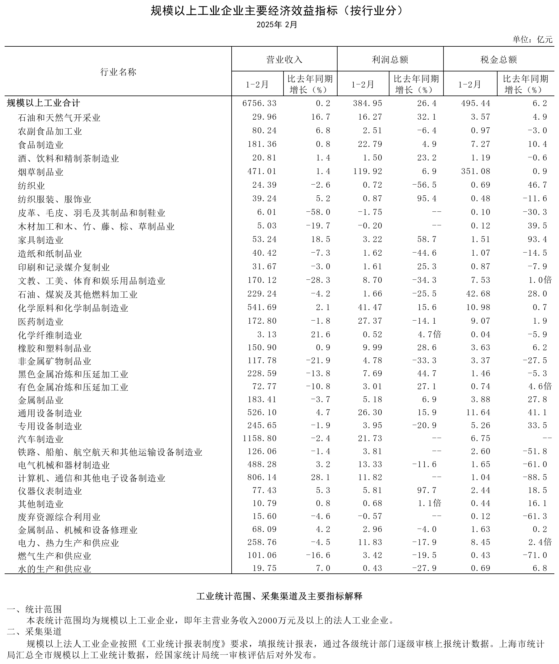 2025年2月规模以上工业企业主要经济效益指标(按行业分)